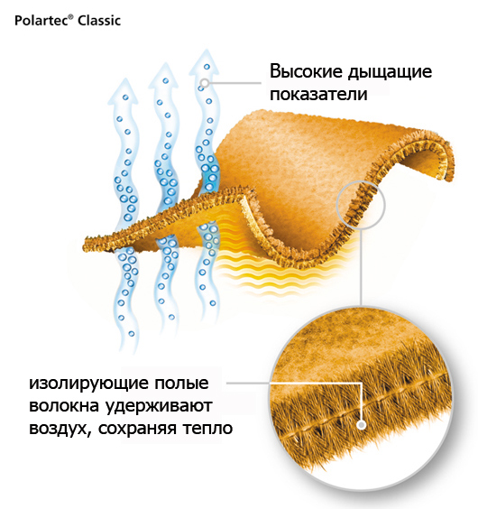 Все эти свойства ткань Polartec имеет благодаря использованию специального полиэстерового волокна и специальному плетению ткани.